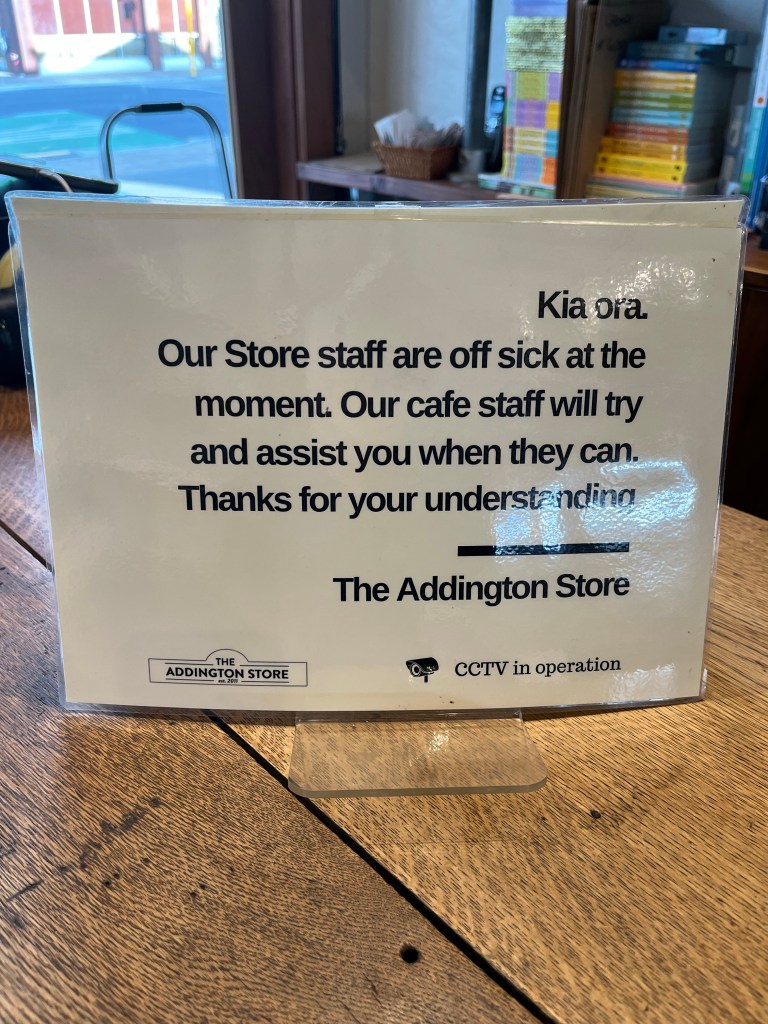 No one working double time to make up for people being out, no pretending like nothing changes for the customer when you’re short staffed, no apology for being sick, just an acknowledgement that people are sick and others will try to help when then can. Perfection!