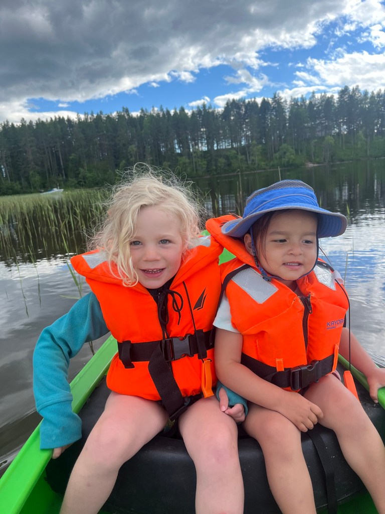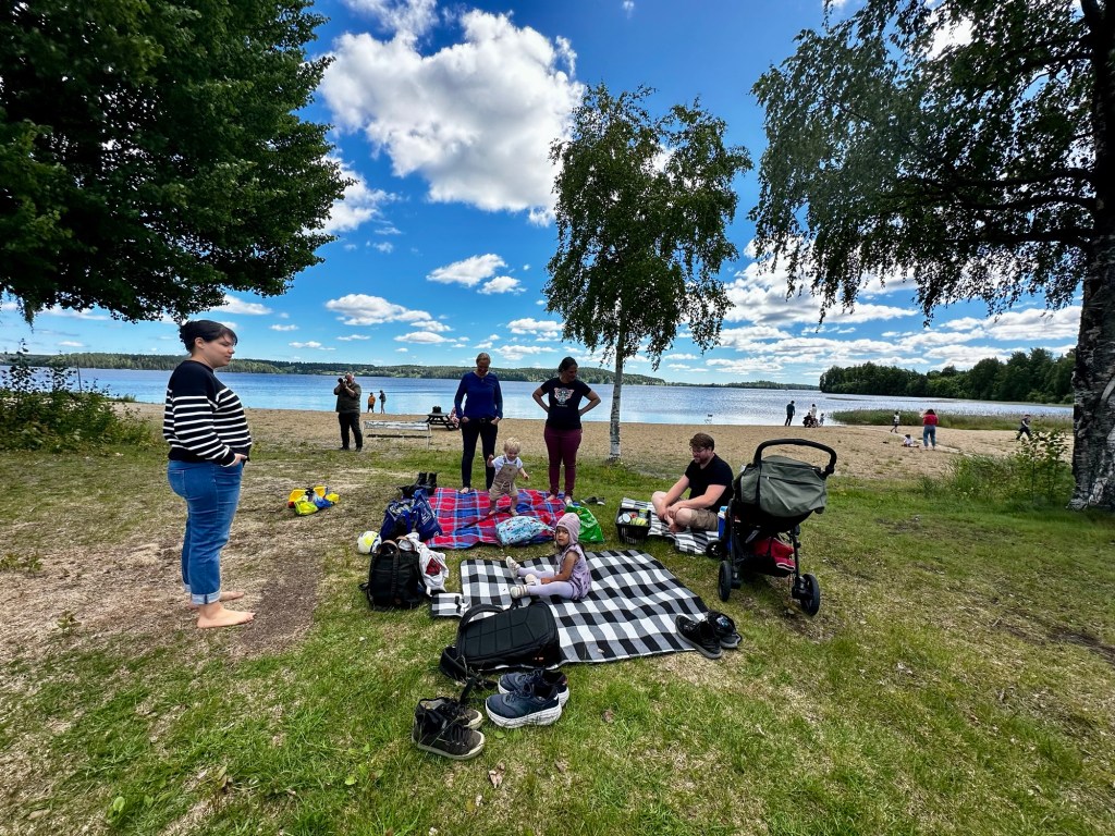 The next day was midsommar’s eve and the day for festivities. It was mostly warm and sunny day except for some wind. We went to a community celebration complete with songs and dances around the maypole. Hudson and Marta prepped a picnic of all the Swedish midsommar classics including herring of many flavored varieties, cheese pie with cream and roe, shrimp salad (mainly mayo), potato salad, etc. It was all… interesting. Definitely a win if mayo is your thing. The herring was a must-try because it’s so ubiquitous with midsommar, but one bite for me was sufficient. The kids had a good time playing on the grounds, in the sand, and of course Mara went straight for the water.