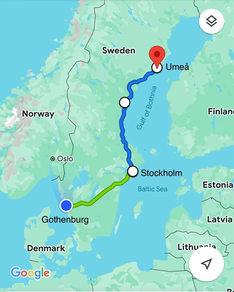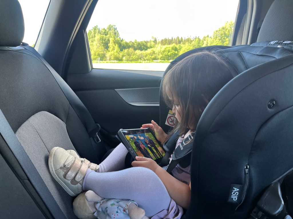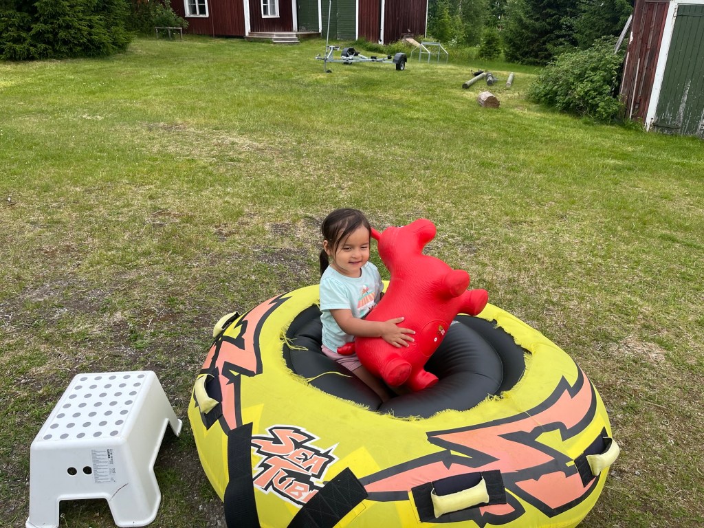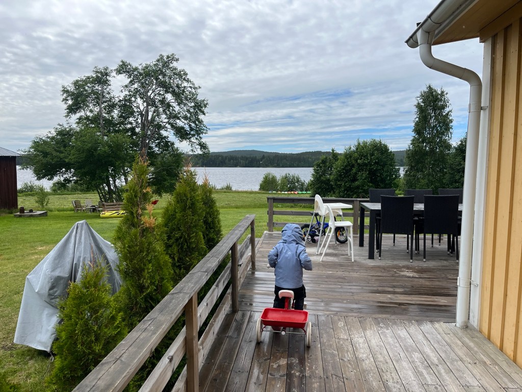 We arrived in Umeå around 7:30am then walked to the central bus station to catch a bus to the airport to pick up our rental car. All of that took less than an hour! At the airport we met up with Wylie’s friend and our host, Marta. She flew in from a work trip at the same time we arrived so we met at the airport and headed to her home. We opted to rent a car seat instead of hauling ours around and we learned that car seats are rear facing in Sweden until around age 4! That was an adventure but we made it work for Mara with lots of help from her iPad.