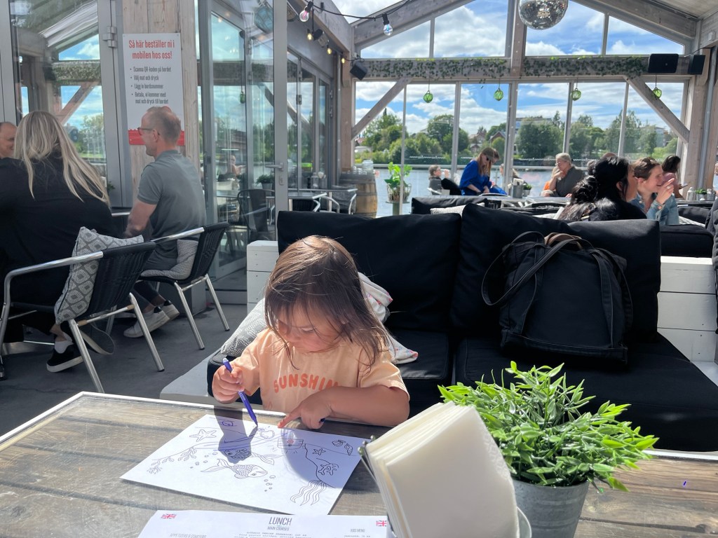 We had a low key dinner at home and said a late night goodbye to Marta and Hudson. The next day was a normal Monday for them, which meant they were all out the door by 6:30am. We were happy to get to take our time before making our way to the town for a couple of hours then flying back to Gothenburg. Mara was actually quite happy to get to play by herself in the morning, especially after lots of toddler negotiating for the best toys all weekend. We went to a scenic restaurant literally on the river for lunch, the food was good, there was space for Mara to jump around a bit, and views were great – win win win. Then we walked around town before heading back to the airport for our two short flights.