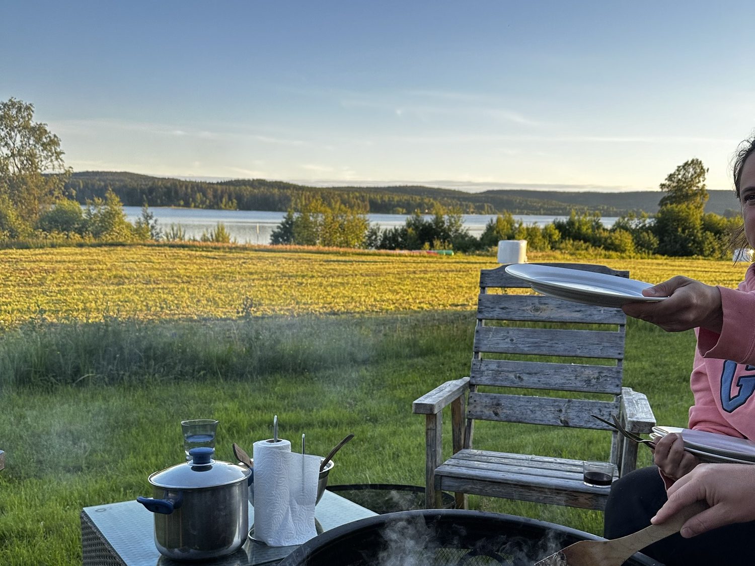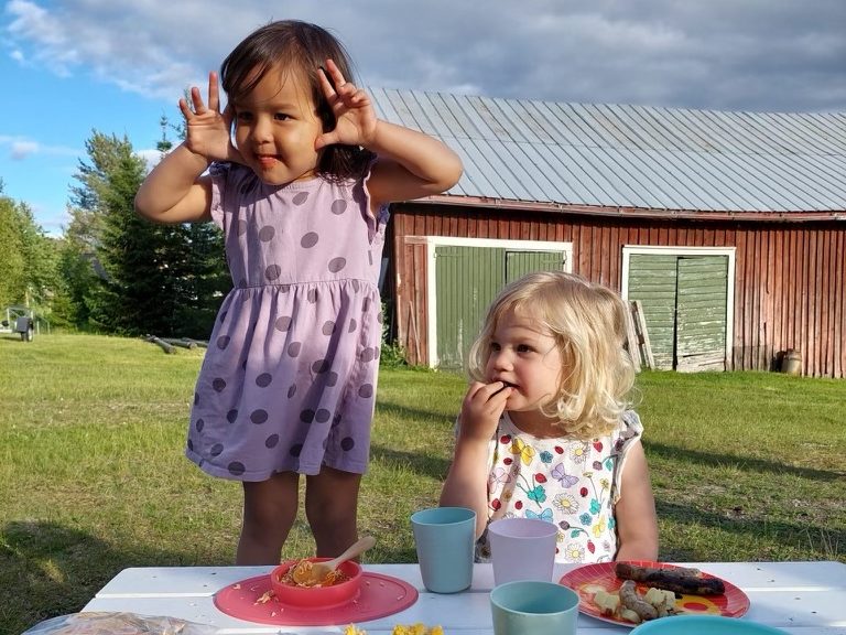 We hung out at the house for the afternoon, Charlotte and Benjamin went to bed early and Mara and Raphael stayed up for a dip of their own in the jacuzzi. Mara was truly living her best life. She was so excited to play in the “hot pool.” After all that activity she went to sleep quickly and the adults had dinner around the fire-pit. Hudson made reindeer stew, his version of a traditional Sami dish of reindeer meat called Suovas. On its own the meat was a bit intense for me but together with the mashed potatoes and homemade lingonberry jam it was quite good. We also sampled a number of Hudson’s home brewed beers – lavender, pine, and my favorite – dandelion. They are real homesteaders, making so many delicious things with what grows on their land.