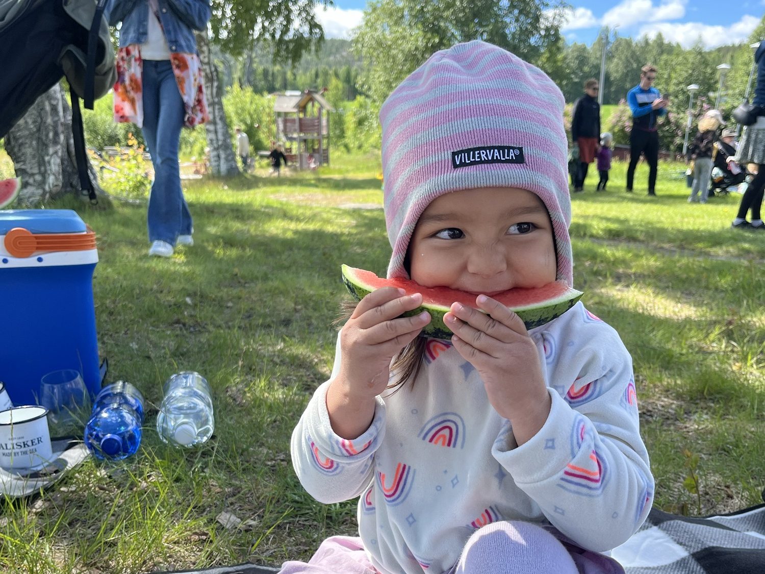 After our morning ice cream we stopped at a grocery store to gather supplies for a hike. Mara quickly fell asleep in the carrier as she does, and we had a nice walk along the Vindelälven river and over swing bridges. We stopped at an open grill that was fully equipped with wood and Hudson grilled up sausages we bought for lunch. Mara woke up mid way through lunch and we all slowly ventured back, with a stop at a playground before getting back in the cars and heading home.